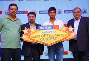 From left to right: Rakesh Singh (Joint President-Marketing, India Cements), Anupam Vasudev (Chief Marketing Officer, Aircel), Cricketer S. Badrinath, Sankara Naraynan K. (Regional Business Head-Chennai & RoTN, Aircel) posing during launching ceremony on Thursday.