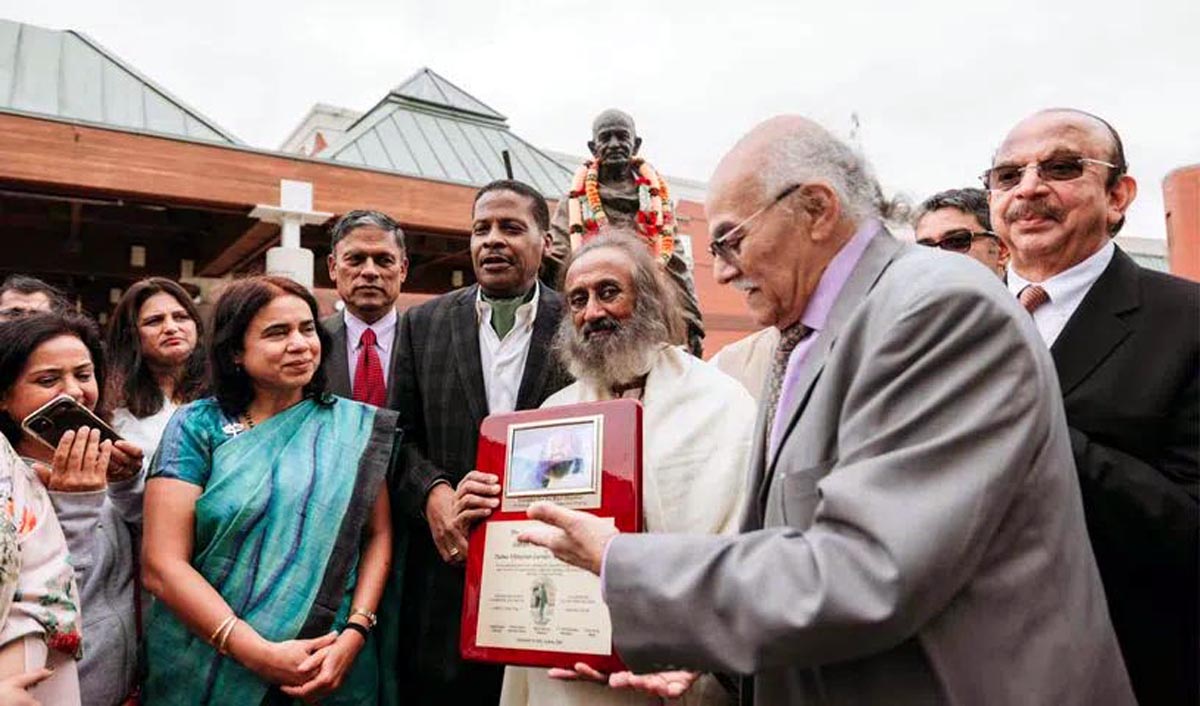 The award was presented to the founder of Art of Living for “his outstanding service and contribution for humanity to bring the change we want to see in the world”, through his wisdom, insight and inspiration in the spirit of Gandhi-King leaching of Peace and Ahimsa” said the citation.