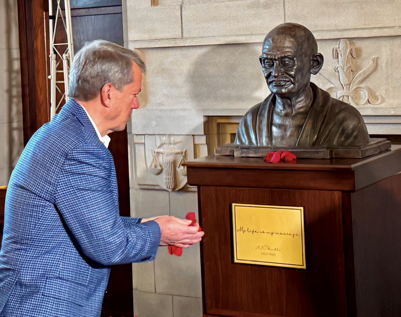 Governor Jim Pillen unveiled the bust of Gandhi on Friday at his office in the iconic Nebraska State Capitol premises in Lincoln.