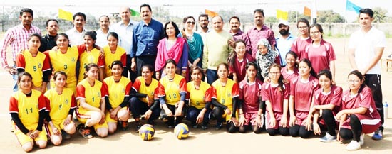 Winners of Volleyball final of Sports Tourney 2018 posing for a group photograph along with dignitaries at GCW Gandhi Nagar in Jammu.