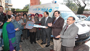 General Manager, State Bank of India, Net Work-III Kumar Rajan donating ambulance under SBI Corporate Social Responsibility to Shri Guru Nanak Mission Hospital, Jammu. The keys of the ambulance were handed over to Dr Mohinder Singh, Chairman-cum-Administrator and