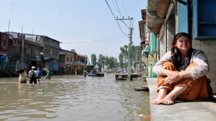 A German woman married to a Kashmiri sits on her partially submerged house in Bemina area of Srinagar on Saturday. -Excelsior/Amin War