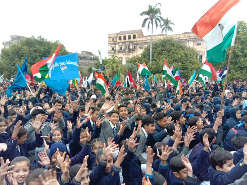 Students during a function organised to remember Mahatma Gandhi on his 72nd death anniversary at Jammu.