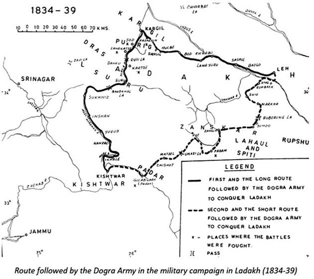 In the early 19th century, Maharaja Ranbir Singh, the second Dogra ruler of J&K had envisioned the security of his kingdom’s northern border. The brave and intrepid Dogra warriors under the command of celebrated General Zorawar Singh (1784 – 12 December 1841) made tremendous sacrifices and annexed the cold and mountainous Himalayan regions of Kargil, Gilgit, Baltistan, Ladakh and Tibet to secure the northern borders of Dogra kingdom.