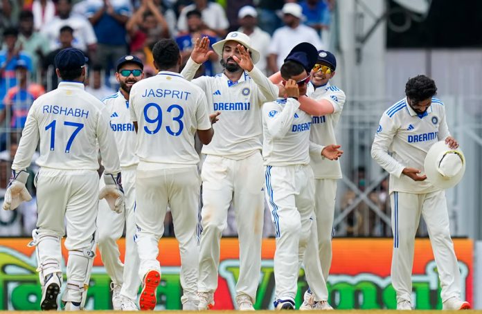 Bangladesh 2nd Innings: Zakir Hasan c Jaiswal b Bumrah 33 Shadman Islam c Gill b Ashwin 35 Najmul Hossain Shanto not out 51 Mominul Haque b Ashwin 13 Mushfiqur Rahim c Rahul b Ashwin 13 Shakib Al Hasan not out 5 Extras: 8 (lb-4, b-4) Total: 158/4 in 37.2 overs Fall of wickets: 1-62, 2-86, 3-124, 4-146 Bowling: Jasprit Bumrah 7-2-18-1, Mohammed Siraj 3.2-1-20-0, Akash Deep 6-0-20-0, Ravichandran Ashwin 15-3-63-3, Ravindra Jadeja 6-0-29-0.