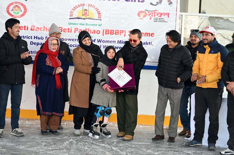 KARGIL, Feb 10: Executive Councillor for Tourism, LAHDC Kargil, Kacho Mohd Feroz, attended the closing ceremony of 15-day Ice Hockey Training-cum-Tournament for girls, organized by District Hub for Women, Mission Shakti, Department of Social and Tribal Welfare, Kargil, in collaboration with DYSS Kargil and the Ice Hockey Association Kargil. The programme was conducted under the Beti Bachao Beti Padhao (BBBP) Scheme, aimed at promoting sports and holistic development among girls.