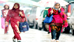 June- 24, 2015- SRINAGAR : kashmiri girls walks under umbrellas to protect themselves at residency road in Srinagar on Wednesday during heavy rainfall in kashmir valley from early morning. Photo/Mohd Amin War