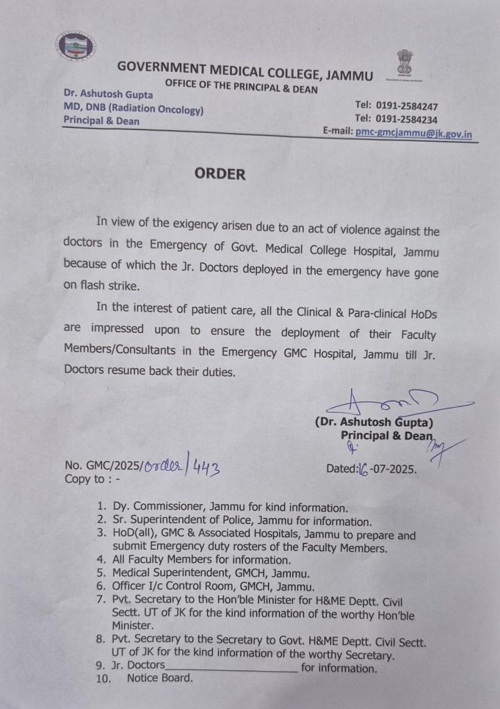 In view of patient care, the Principal and Dean of GMC Jammu, Dr Ashutosh Gupta has directed all Clinical and Para-clinical HoDs to ensure deployment of faculty members and consultants in the Emergency Ward till the junior doctors resume their duties.