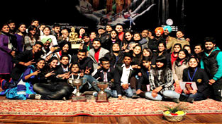 GNDU teams with Overall Championship Trophy posing for group photograph during valedictory function of North Zone Inter-University Youth Festival at JU on Monday.