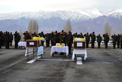 LEH, Mar 29: Army soldiers Bhawan Tamang (Hav) and Sep Sunil Rai, who were martyred during an avalanche in the Turtuk Sector of Ladakh on March 25, 2016, were accorded full military honours in a solemn wreath laying ceremony held in Leh city on Monday.