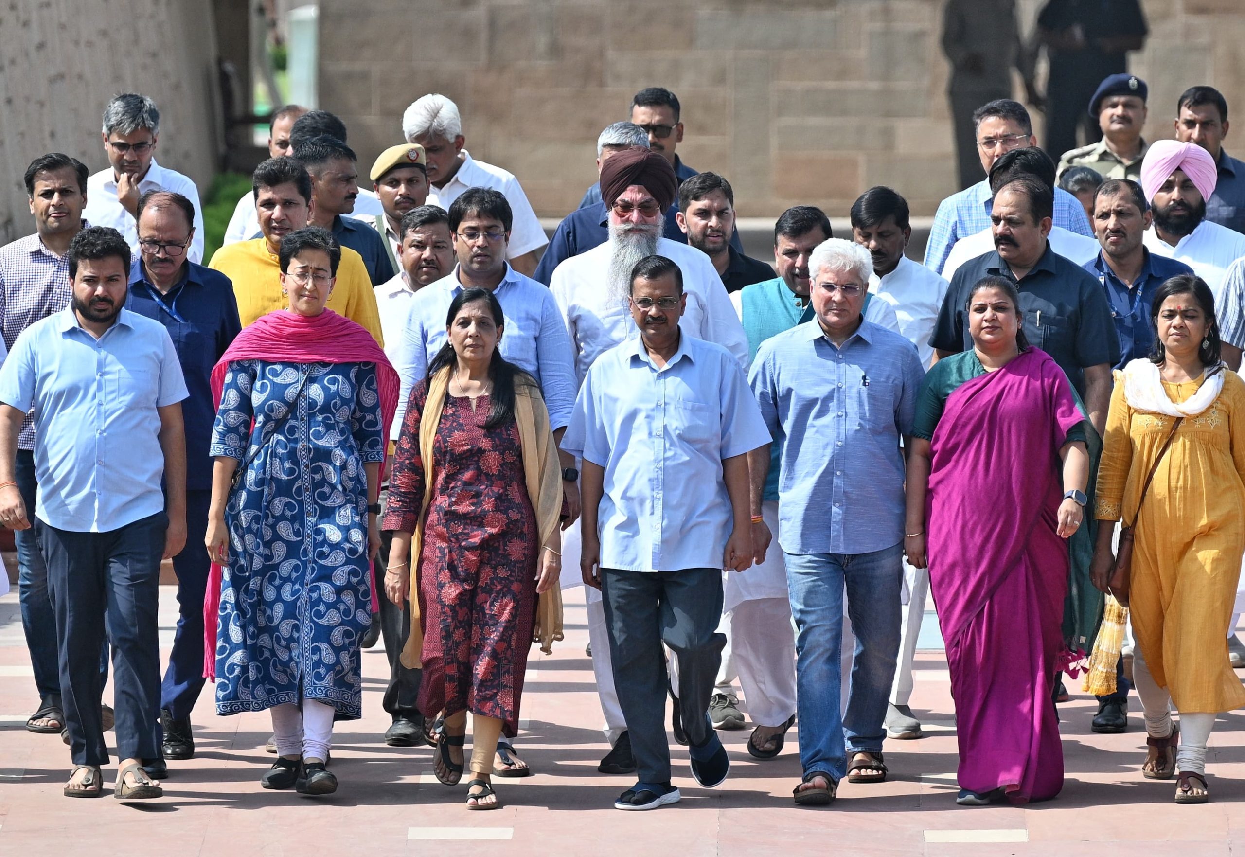 Before reaching party office, Kejriwal paid homage to Mahatma Gandhi at the Rajghat and then offered prayers at the Hanuman temple in Connaught Place.