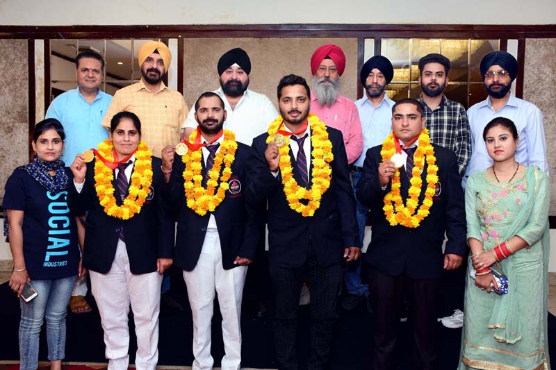 Gold medal winner in International event State Tug of War players posing with office bearers of the Association at Jammu on Wednesday.