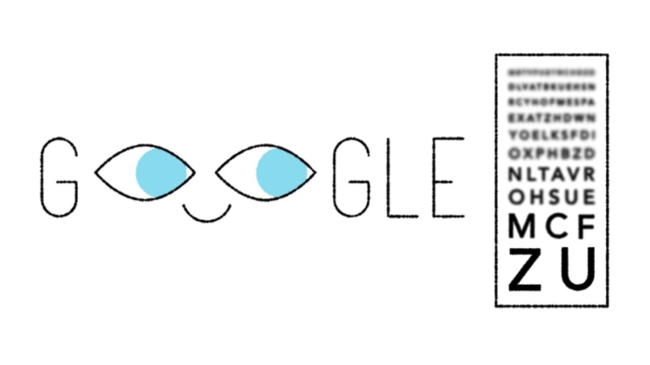 The colourful animated doodle, shows a pair of eyes taking an eye exam – squinting at the hard-to-read alphabet chart.