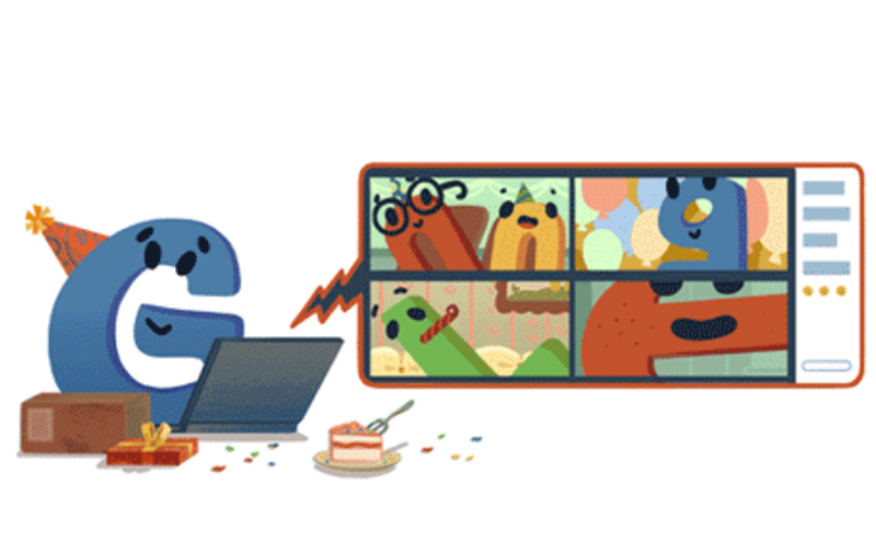 For Google’s birthday, the letter G is seen surfing on a laptop with the rest of the letters having fun on a larger adjacent screen. Not to miss, the details of the gift box and cake on the table.