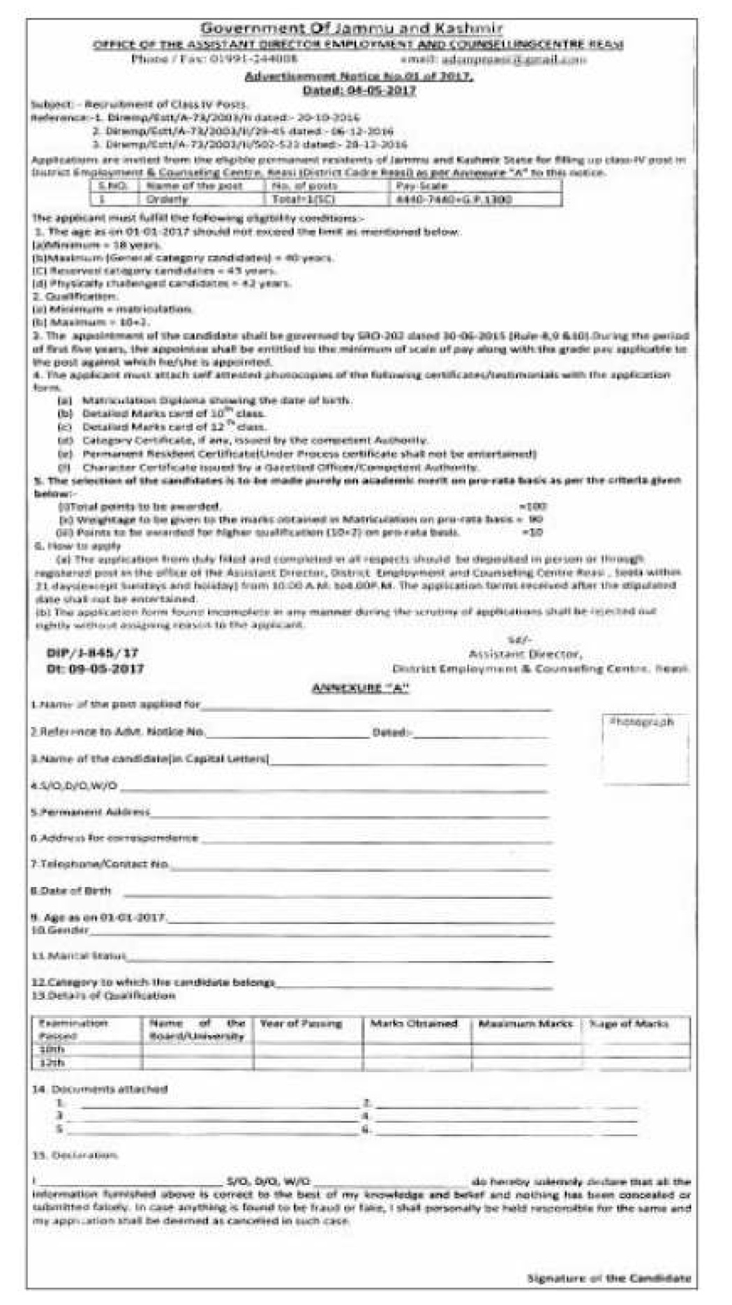 GOVERNMENT OF JAMMU AND KASHMIROFFICE OF THE ASSISTANT DIRECTOR EMPLOYMENT AND COUNSELLING CENTRE REASI