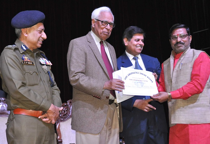 JAMMU: At a function organised by Shri Amarnathji Shrine Board at Jammu, Governor N. N. Vohra, who is Chairman of the Shrine Board (SASB), felicitated Langar Organisations for voluntarily rendering valuable services to the pilgrims in every annual Yatra. He distributed Certificates of Appreciation to 120 Langar Organisations and NGOs who established Langars and rendered varied services to the Yatris during Shri Amarnathji Yatra 2016. Dr. S. P. Vaid, Director General of Police was present on the occasion.