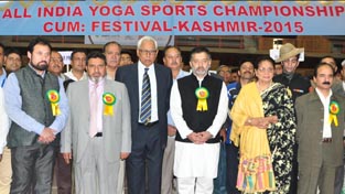 Governor N N Vohra and other dignitaries posing for a group photograph during Inaugural ceremony of Yoga Sports Championship in Srinagar on Saturday.