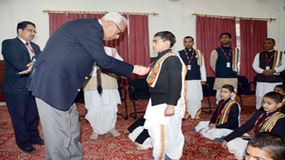 Governor N N Vohra interacting with students of the SMVD Gurukul on Monday.