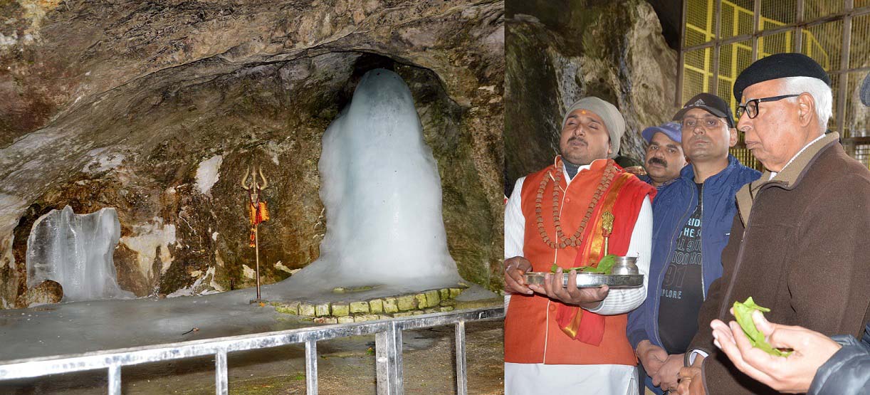 SRINAGAR, June 28: On account of continuing rain since last night the annual Yatra to the Holy Cave Shrine of Shri Amarnathji in the Kashmir Himalayas commenced rather late today, around noon, from both the Pahalgam and the Baltal routes. Governor N. N. Vohra, Chairman of the Shri Amarnathji Shrine Board, alongwith CEO of the Board, senior Army, Police, Central Police and Civil Administration Officers, paid obeisance at the Sanctum Sanctorum and participated in the Pratham Pooja ceremony. He prayed for sustained peace, harmony, progress and prosperity in the State.