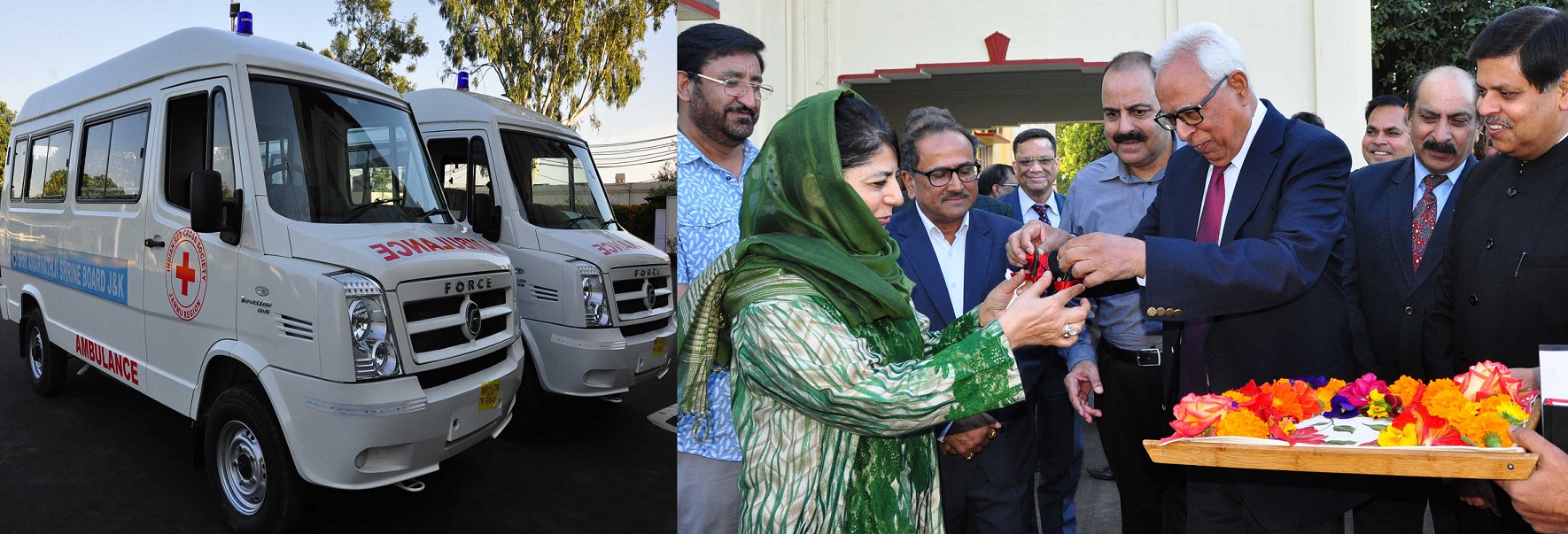 JAMMU, MARCH 3: Governor N.N. Vohra, who is the Chairman of the Shri Amarnathji Shrine Board (SASB), presented two Ambulances to the Chief Minister Mehbooba Mufti, who is Vice- President of the Indian Red Cross Society-J&K. As per a prior commitment, Shri Amarnathji Shrine Board has presented these Ambulances to the Indian Red Cross Society, J&K, for their use by the Kashmir and Jammu Regional Branches.