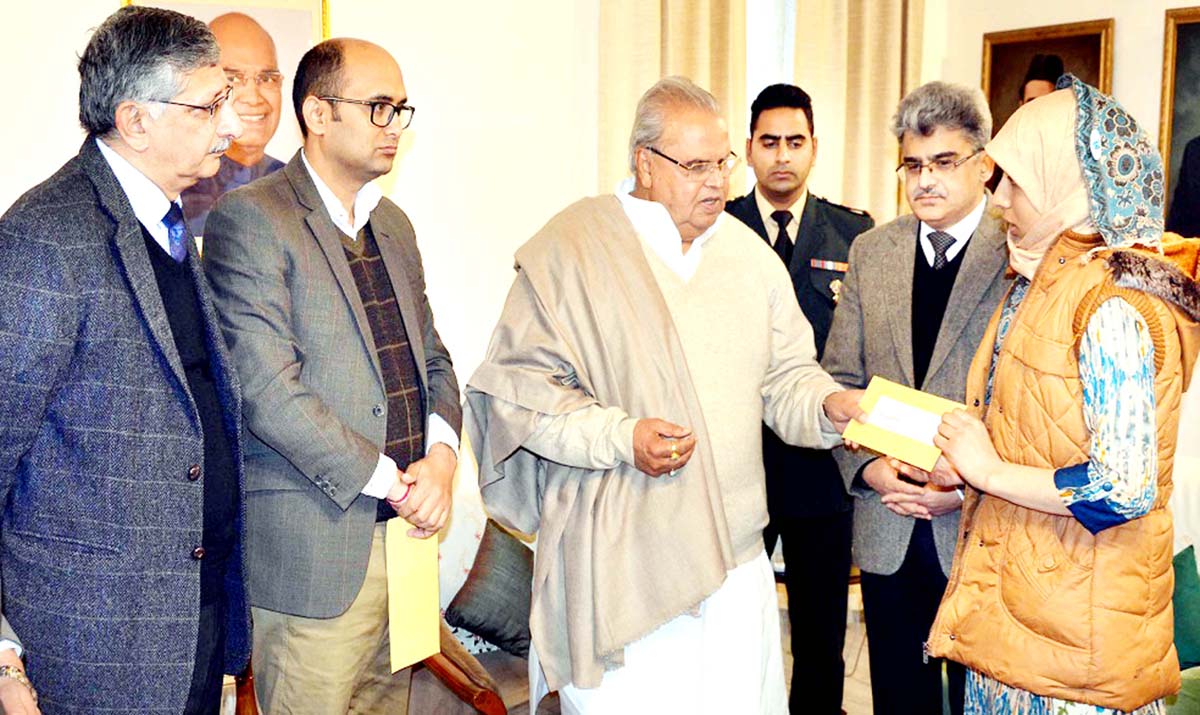 Governor Satya Pal Malik giving away cheque to kin of deceased ASHA worker at Raj Bhavan on Monday.
