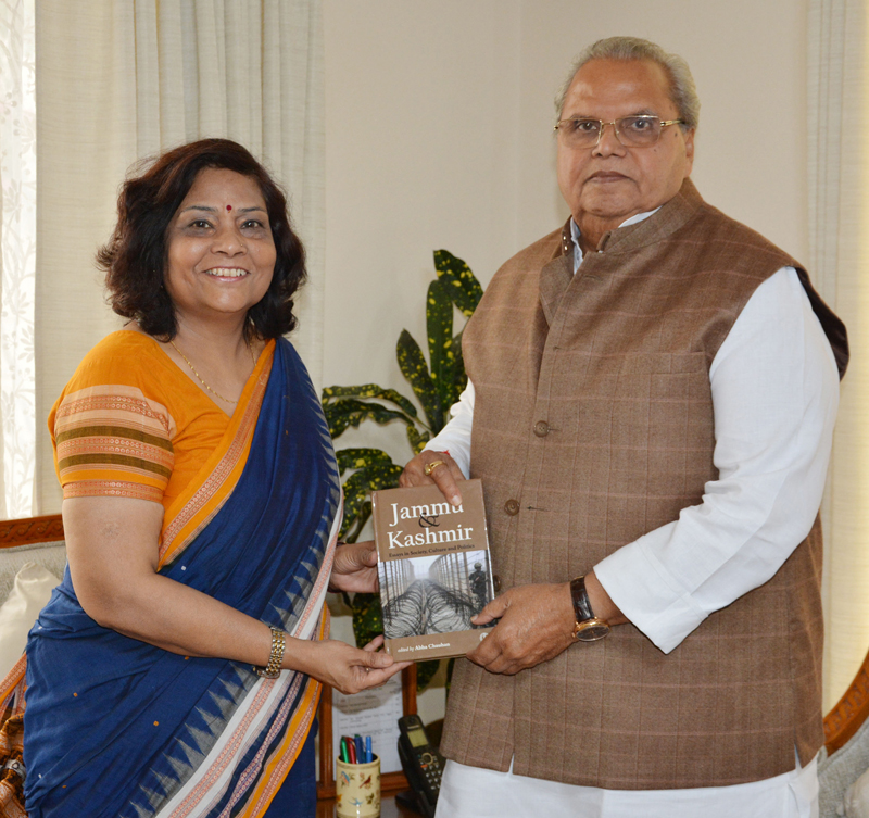Governor Satya Pal Malik receiving book from Prof Abha Chauhan.