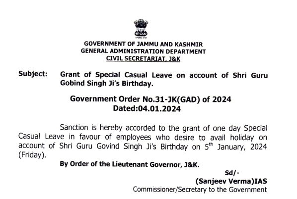 JAMMU, Jan 4: The Jammu and Kashmir Government on Thursday announced special casual leave for employees who desire to avail holiday on Guru Govind Singh’s birth anniversary on Friday.