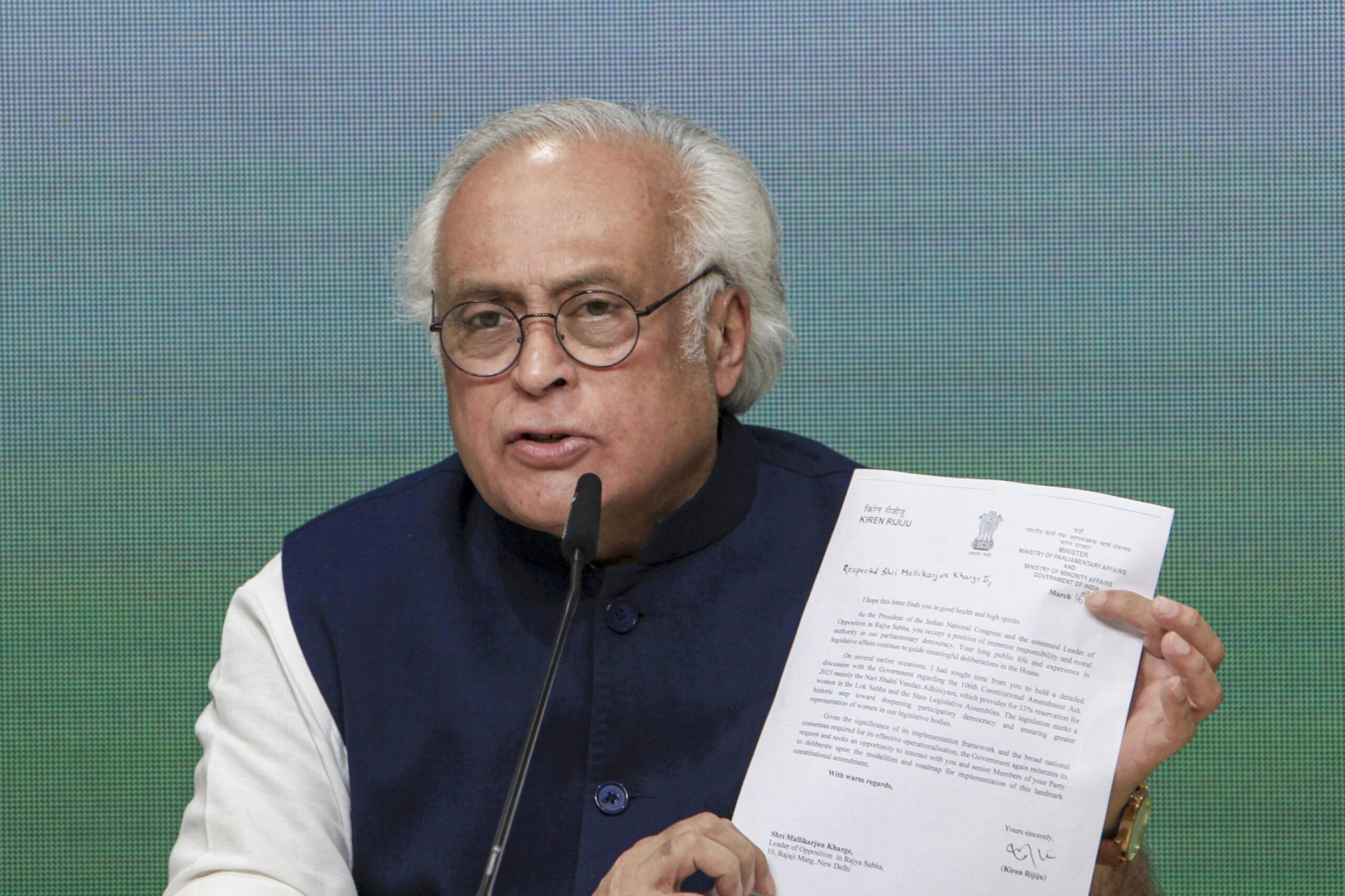 “After two days on March 26, Rijiju wrote to Kharge ji that Congress should meet us and hold talks on the constitutional amendment. Half an hour later, Kharge ji responded to Rijiju and reiterated the demand for an all party meeting after April 29,” he said, narrating the sequence of events.