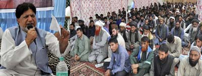 Sheep Husbandry Minister Ab Ghani Kohli addressing a public gathering in Srinagar on Tuesday.