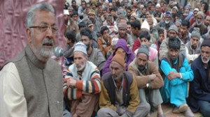 Minister for Medical Education, Taj Mohi-ud-Din addressing public gathering at Uri on Saturday.