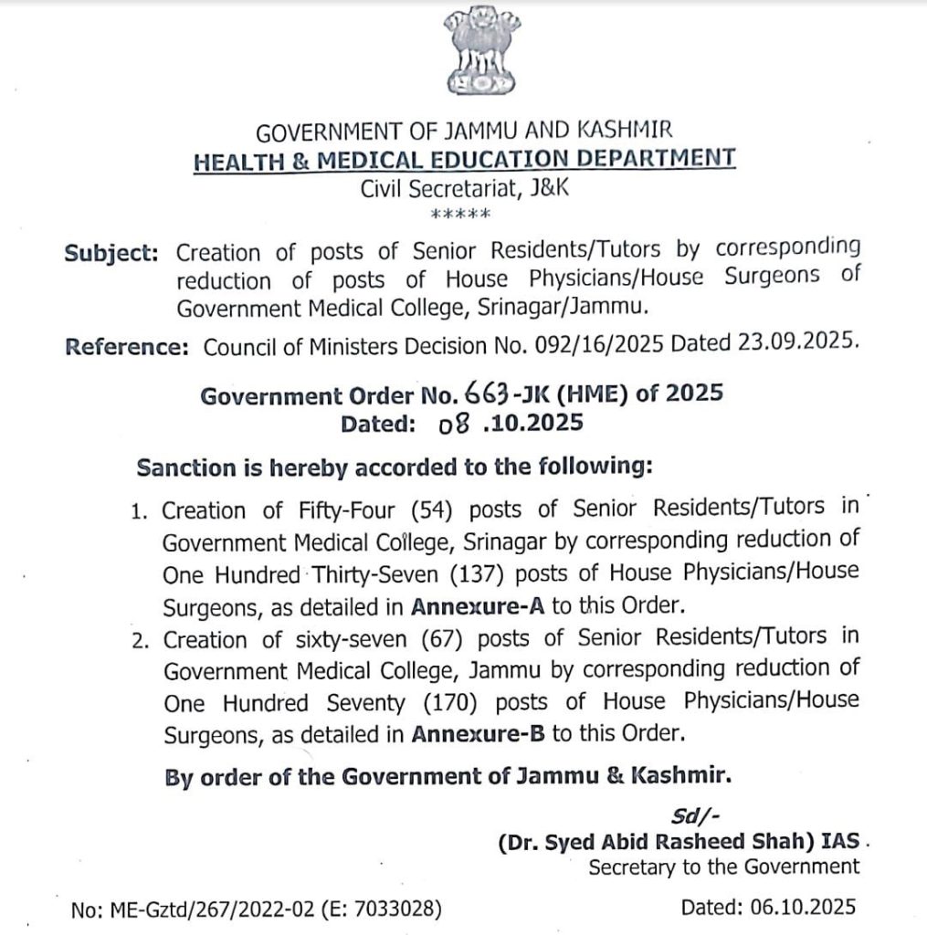 As per Government Order No. 663-JK (HME) of 2025, issued by the Health and Medical Education Department, 54 posts of Senior Residents/Tutors have been created in GMC Srinagar by reducing 137 posts of House Physicians/House Surgeons. Similarly, 67 Senior Resident/Tutor posts have been created in GMC Jammu by reducing 170 such posts.