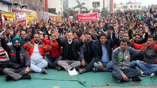 Govt employees and temporary workers staging protest dharna at Divisional Commissioner’s office in Jammu on Tuesday. —Excelsior/Rakesh