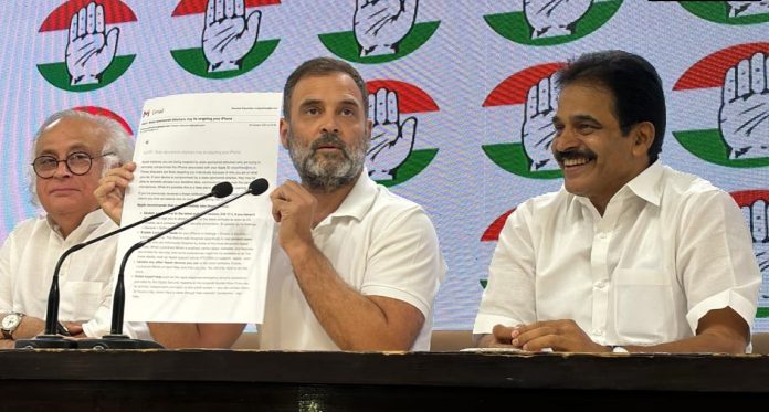 During a press conference, Gandhi showed a copy of the warning e-mail received by several Opposition leaders from Apple phone manufacturer about “state-sponsored attackers trying to compromise” their phone.