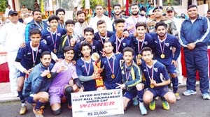 Young footballers posing along with Minister for Forest, Ch Lal Singh at BSF Stadium, Paloura in Jammu.