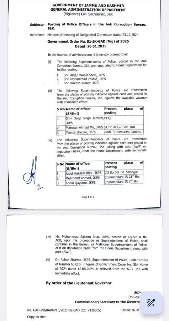 Also, Javid Hussain Bhat (JKPS), Mehmood Ahmad (JKPS) and Abdul Qayoom (JKPS) have been posted in ACB on deputation basis.