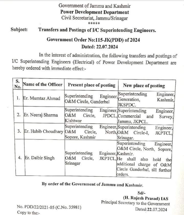 J&K | Four PDD Incharge SEs Transferred By Daily Excelsior - July 22, 2024 Share FacebookTwitterWhatsAppPinterestLinkedinCopy URLTelegramEmailTumblrReddItPrintKoo JAMMU, July 22: The Power Development Department (PDD) has ordered the transfer and posting of four Incharge Superintendent Engineers (SEs). Follow our WhatsApp channel