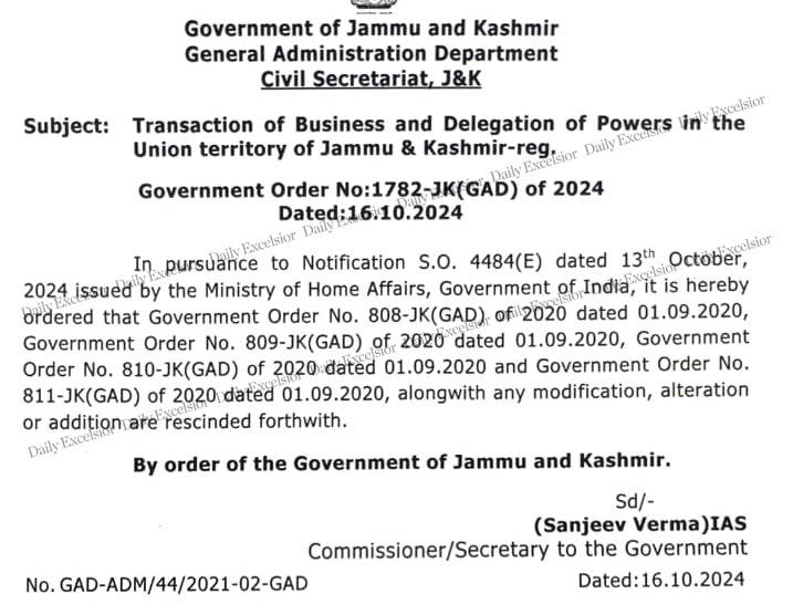 Govt Rescinds Orders Empowering LG, His Advisors In Administrative Council By Daily Excelsior - October 16, 2024 Share FacebookTwitterWhatsAppPinterestLinkedinCopy URLTelegramEmailTumblrReddItPrintKoo JAMMU, Oct 16: The Jammu and Kashmir Government has rescinded several orders that empowered LG as the Chairman of the Administrative Council (AC), with his Advisors, and other officers holding the powers of the Ministers in the Council. Follow our WhatsApp channel
