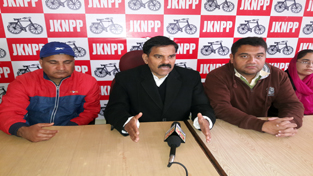 NPP leader Harshdev Singh addressing press conference in Jammu on Sunday.