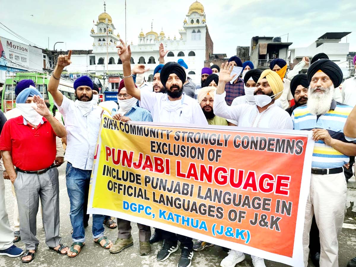 JAMMU, Sept 4: The Sikh community led by Gurudwara Prabandhak Committee (GPC), Kathua held a demonstration here, today in protest against the non inclusion of Punjabi language as official language of J&K. A large numbers of members of Sikh community assembled at Mukhreejee Chowk here in support of their demand showing resentment against the Government decision.