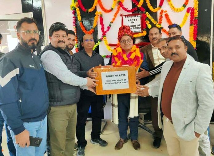 JAMMU, Nov 23: A grand and heartfelt farewell party was organized by the staff of Medical Block Ghat in the honour of Chief Medical Officer (CMO) Doda Dr Om Kumar, who attained superannuation after rendering 29 years of dedicated and exemplary service in the Health Department.