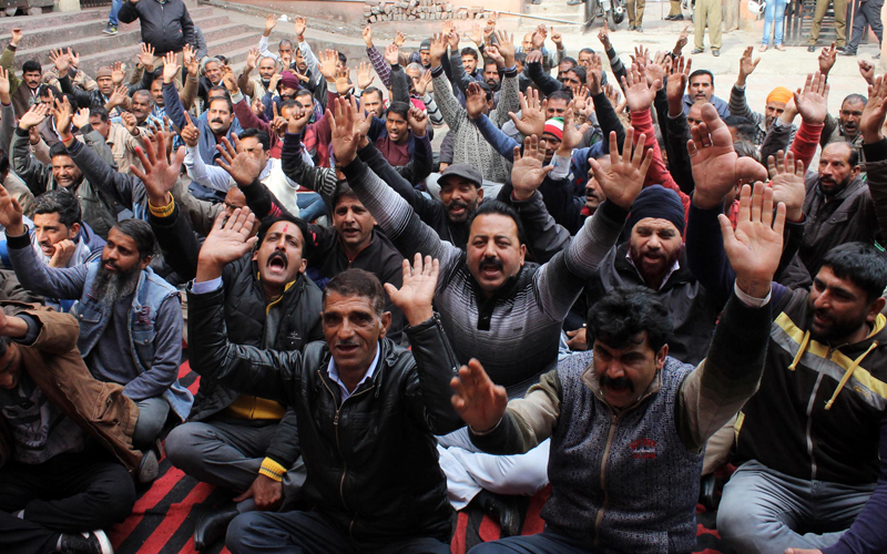 The employees under the banner of GSA (Jammu province), led by Hoshiyar Singh, Bhanu Sambyal, Binkel Manhas and others assembled here at the complex and continued their protest on fifth consecutive day. They are demanding settlement of their long pending demands.