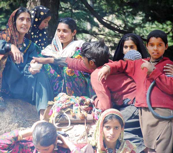 Gujjar nomad family resting on roadside during winter migration from upper reaches of Doda belt towards plain areas. (UNI)