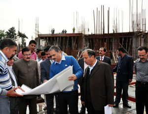 Speaker Legislative Assembly Mubarak Gul inspecting construction work on Legislature Complex at Jammu on Friday.