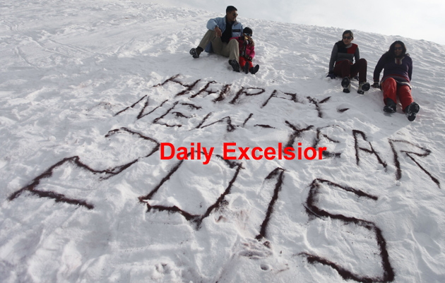 GULMARG: A group of tourists writes New Year greetings on snow on the eve of New Year, 2015 at Kongdoori at world famous tourist resort Gulmarg, on Thursday. Excelsior/ Mohd Amin War