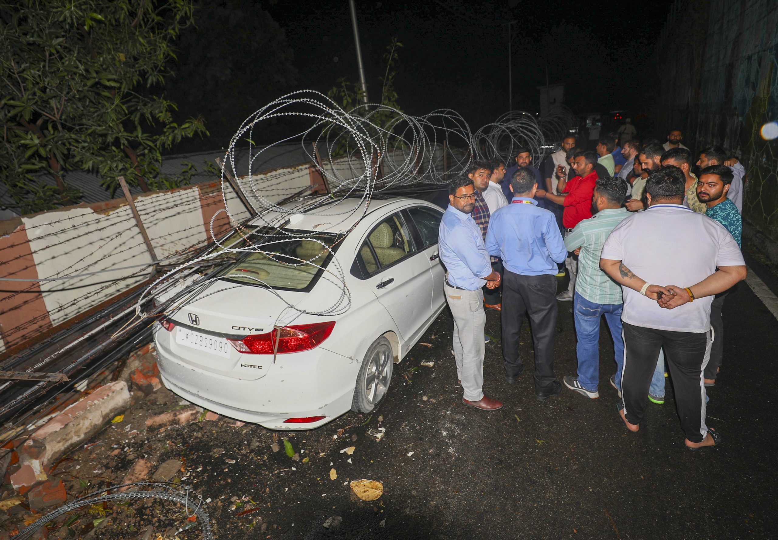 Jammu, Apr 16: A portion of the civil secretariat’s boundary wall and dozens of vehicles and houses were damaged as gusty winds and thundershowers hit Jammu on Wednesday evening, also plunging the city into darkness, officials said.
