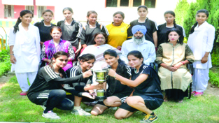 Handball team of Government College for Women (GCW) Parade Jammu, which won the title trophy of the Inter-College Handball Championship, organized by the University of Jammu recently. GCW Parade defeated GCW Gandhi Nagar in the summit clash. The team is posing along with College Principal, Dr Renu Goswami and other dignitaries in the College premises on Monday.