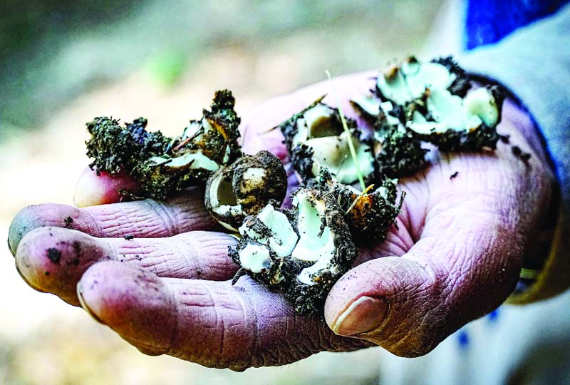 Hands narrate the search for wild vegetables, Shajkan or Kanpopar, amidst the scenic landscape of Gujjar Sangri in North Kashmir’s Baramulla district. —Excelsior/Aabid Nabi