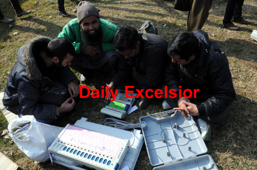 HANDWARA : Kashmiri election officials check a Electronic Voting Machines (EVMs) before leaving towards a polling station at Govt.Industrial Training Institute in North Kashmir’s Handwara frontier district of Kupwara, on Monday. Security has been beefed up ahead of the Assembly elections in Srinagar Kupwara district which is scheduled 2nd the December, 2014. Photo/Mohd Amin War