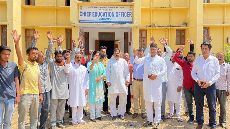UDHAMPUR, June 13: Up in arms against acute deficiency of teaching staff in various rural area schools of District Udhampur, senior AAP leader and former minister Harsh Dev Singh led a protest demonstration outside the office of CEO Udhampur.