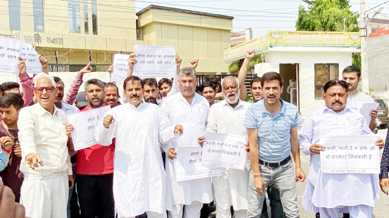 JAMMU, May 2: Accusing the BJP leadership of having demeaned diminished and humiliated the Dogras through its utterances, actions and conduct, a strong contingent of youth and civil society members led by Harsh Dev Singh former minister held a massive protest outside BJP office, Jammu today.